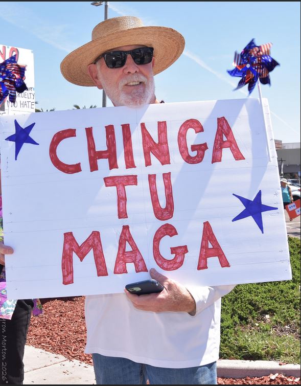 Byron Morton sent a batch of shots from Chula Vista. He reported, “There were about 250 people of all walks on the sidewalks bordering the intersection of H Street and Broadway. There were multilingual signs. Protesters blew whistles and cars honked constantly in passing.”