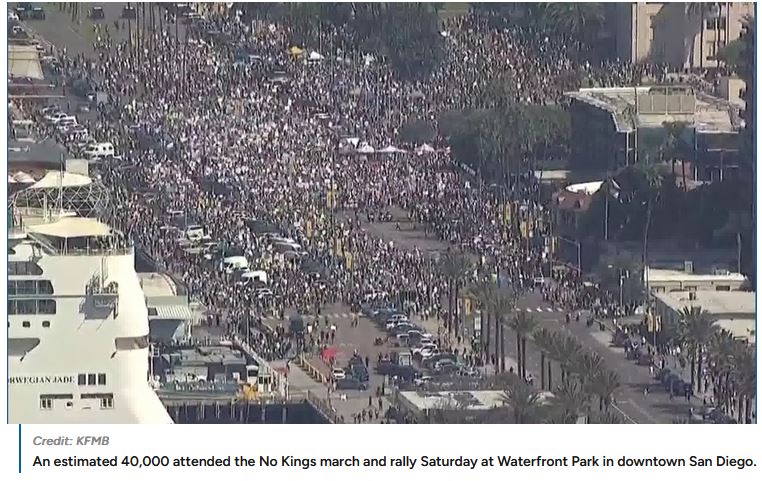 3:57 PDT Today’s local No Kings organizers have this report out: More than 77,000 San Diegans across the county