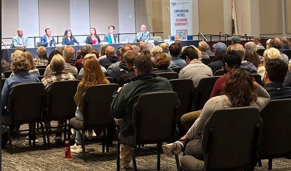 San Diego City Council. I attended the candidate forum last night in Liberty Station — and the cavernous hall was packed — a great turnout. Someone told me the hall had a capacity of 200 or 250. Lots of gray heads. Six candidates were on the stage: Richard Bailey, Paul Suppa, Mandy Havlik, Jacob Mitchell, Nicolle Crosby and Josh Coyne.