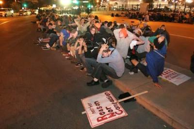 At 12th and Cedar Streets, police in riot gear took the protesters’ green banner and effigy of John McCain. About 30 protesters sat in the intersection, making peace signs with their fingers. Police took more than 12 people into custody. Movable steel barricades and dump trucks blocked the intersection.