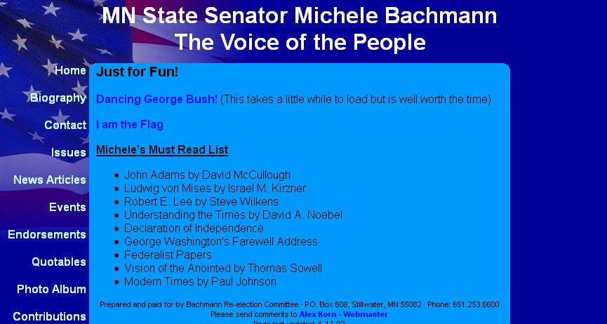 That is actually much more disturbing than entertaining. But if you share a common cause for following Bachmann’s nincompoopery, subscribe to Dump Bachmann, a blog that has covered her since 2004, when she was a Minnesota state senator having ousted the 28-year republican incumbent Gary Laidig with a run Bachmann said was not planned. This miraculous faux pas earned Laidig’s recent wrathful description of Bachmann as a “girl scout with a switchblade knife.”