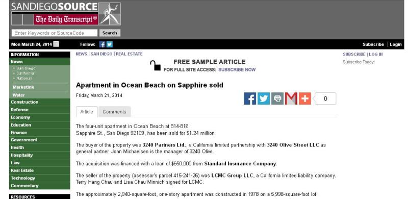 Recently San Diego’s Daily Transcript, the town’s main journal on business and property transactions, ran a headline and article describing a sale of apartments in Ocean Beach. “Apartment in Ocean Beach on Sapphire Sold”.