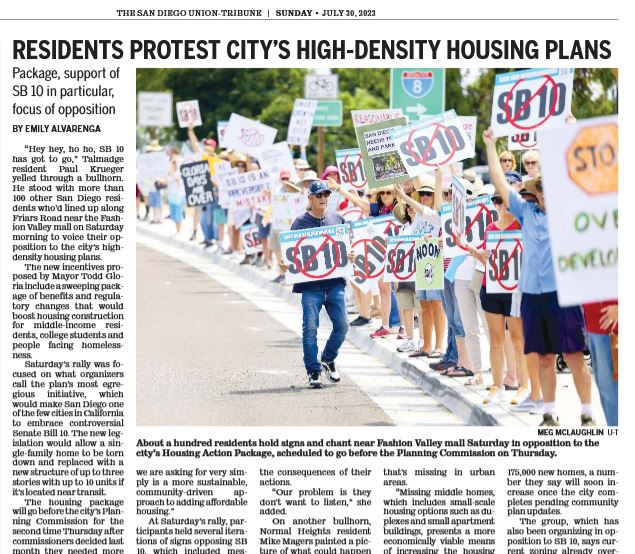 Hundreds rallied in Mission Valley on Saturday, July 29, in opposition to Senate Bill 10 and other housing policies of Mayor Gloria and the City Council.