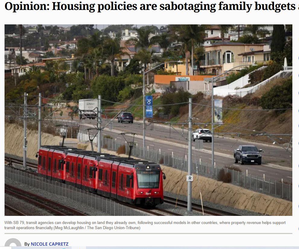 In response to Nicole Capretz’s commentary (SDUT August 28, 2025, Housing policies are sabotaging family budgets and climate goals), the housing densification policies in force across California make our state the least affordable in the nation. Senate Bill 79 (SB 79) would make this even worse.