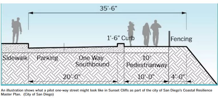 The cliffs will continue to erode at a slow rate as they have for years. It’s premature to take Sunset Cliffs Blvd to a one-way street. Part of a real solution would be to clean debris and sand from the curb, then add an asphalt curb to replace portions that are missing. Without a curb, water can go over the cliff and erode the bluff.