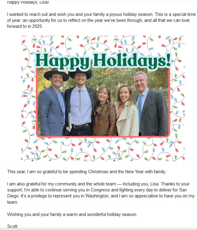 Lisa Mortensen was sent a holiday greeting recently from Congressmember Scott Peters. Here’s her holiday greeting back and response.