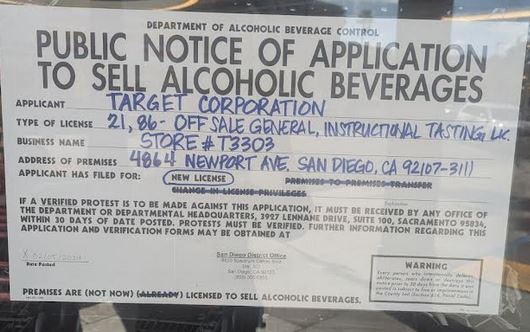 There’s a new sign adorning the windows of the Ocean Beach Target that has taken some residents aback. It’s a Public Notice announcing an application to sell alcoholic beverages within the giant corporate store.