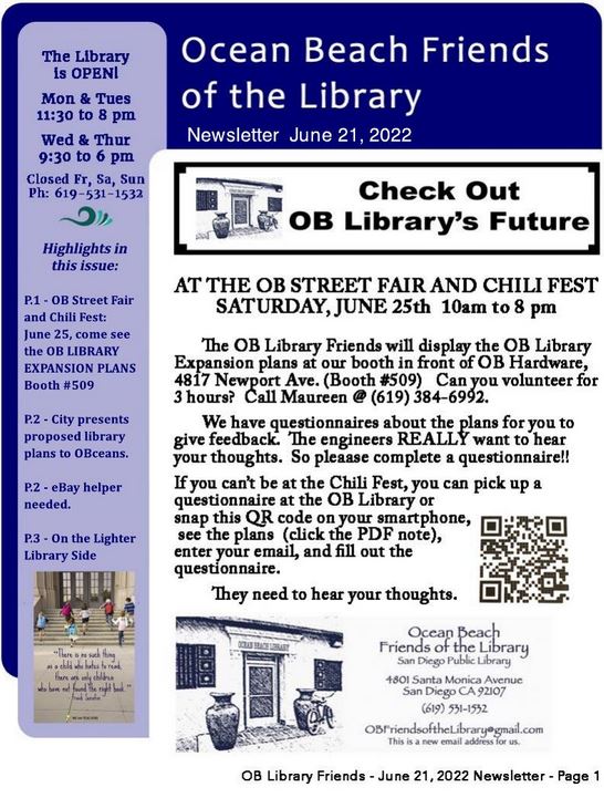 Here’s the latest newsletter, dated June 21, from the OB Friends of the Library.